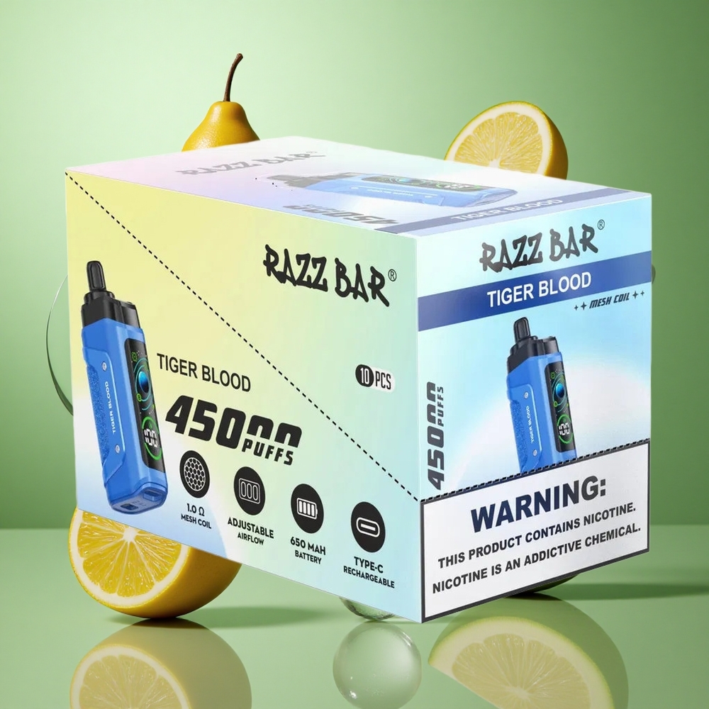 De Razz Bar 45000 Puffs Disposable Vape biedt een premium vaping-ervaring met zijn indrukwekkende duurzaamheid en krachtige prestaties. Met een enorme capaciteit van 45000 puffs, een 1.0 Ohm Mesh Coil voor intense smaak, en een Type-C oplaadbare 650 mAh batterij, is dit apparaat perfect voor lange sessies. De instelbare luchtstroom en 20 mg/ml nicotinegehalte zorgen voor een gepersonaliseerde en bevredigende ervaring.